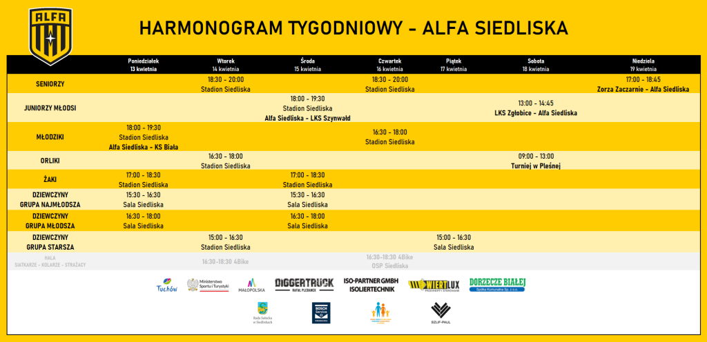 Przed piłkarzami i zawodniczkami Alfy Siedliska pracowity tydzień. Nasze drużyny zagrają 4 mecze ligowe oraz wezmą udział w turnieju piłkarskim. Poza tym trenujemy i podnosimy swoje umiejętności sportowe. Zapraszamy na treningi i mecze.
