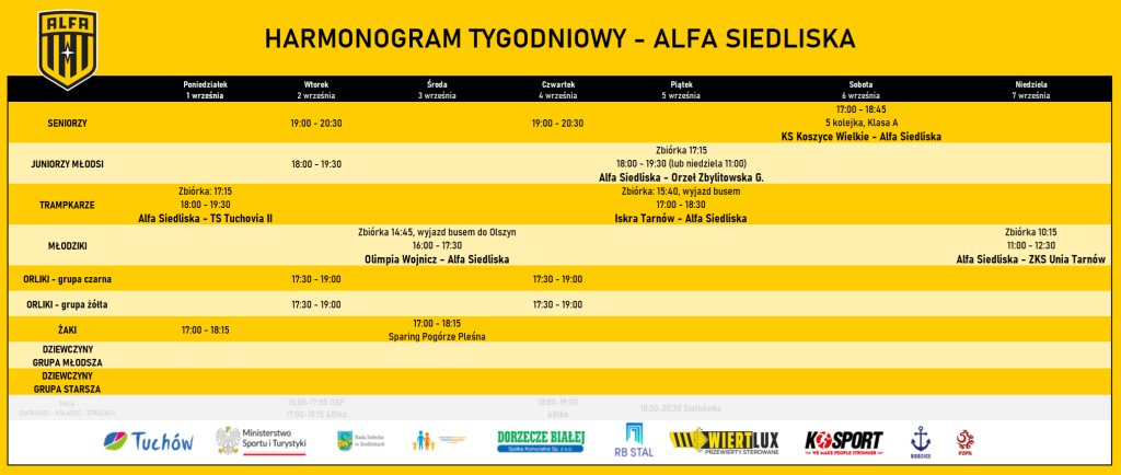 Zaczynamy rok szkolny, a w naszym klubie sezon piłkarski rozkręcił się na dobre. Zespoły uczestniczące w rozgrywkach ligowych będą rywalizować w swoich kategoriach wiekowych. W tym tygodniu czeka nas 6 spotkań, seniorzy po raz pierwszy w tym sezonie rozegrają mecz na wyjeździe – rywalem będzie KS Koszyce Wielkie. Po dwa mecze czeka zespoły trampkarzy i młodzików, natomiast juniorzy zagrają z Orłem Zbylitowska Góra (termin w trakcie ustalania).